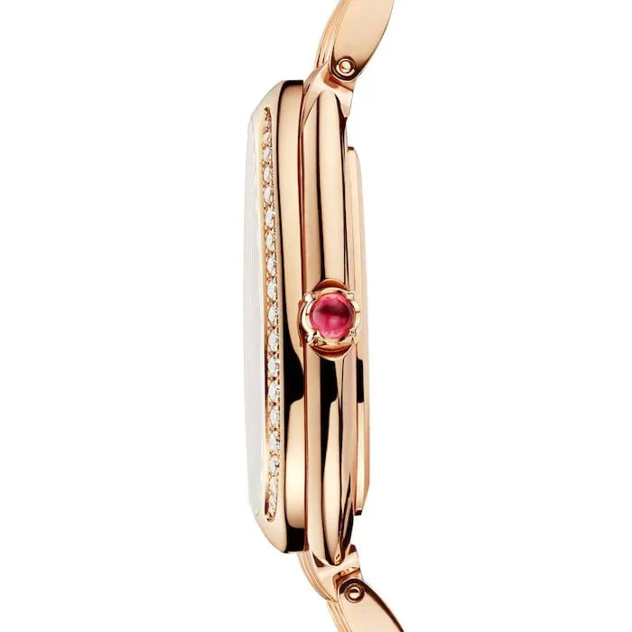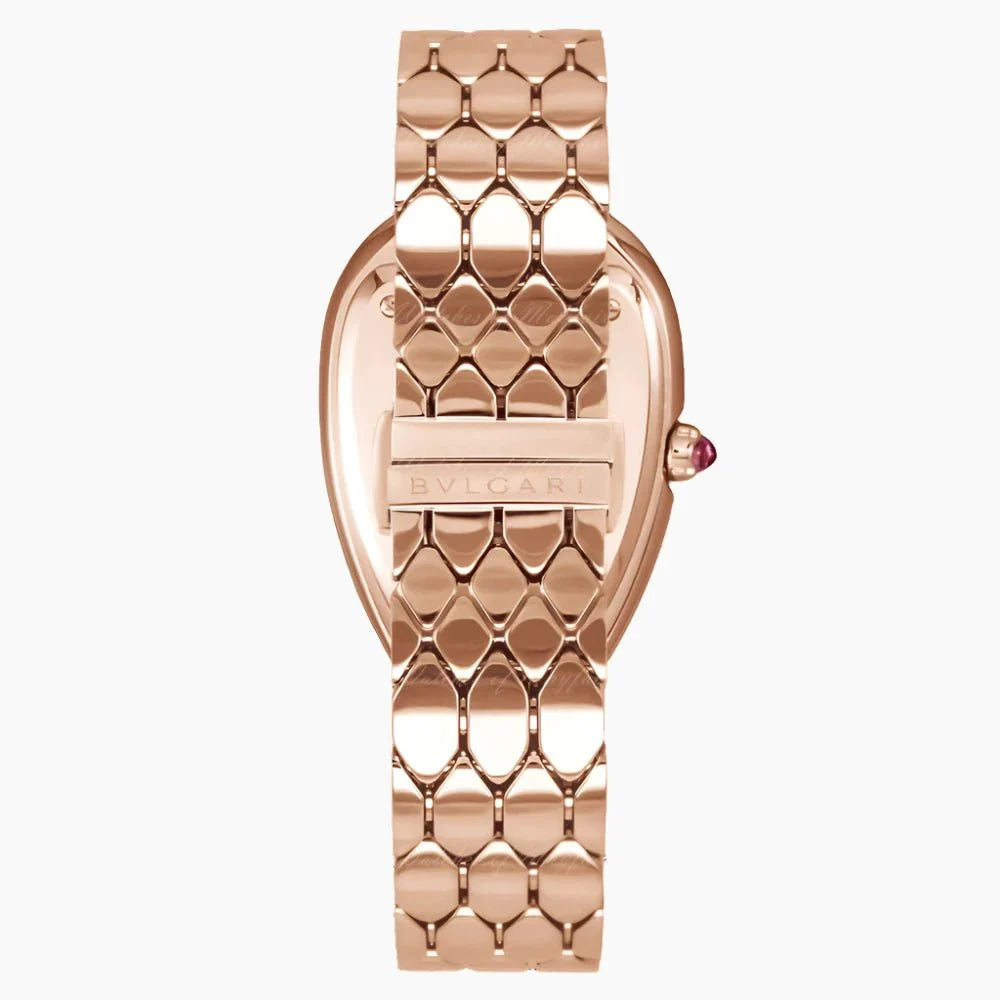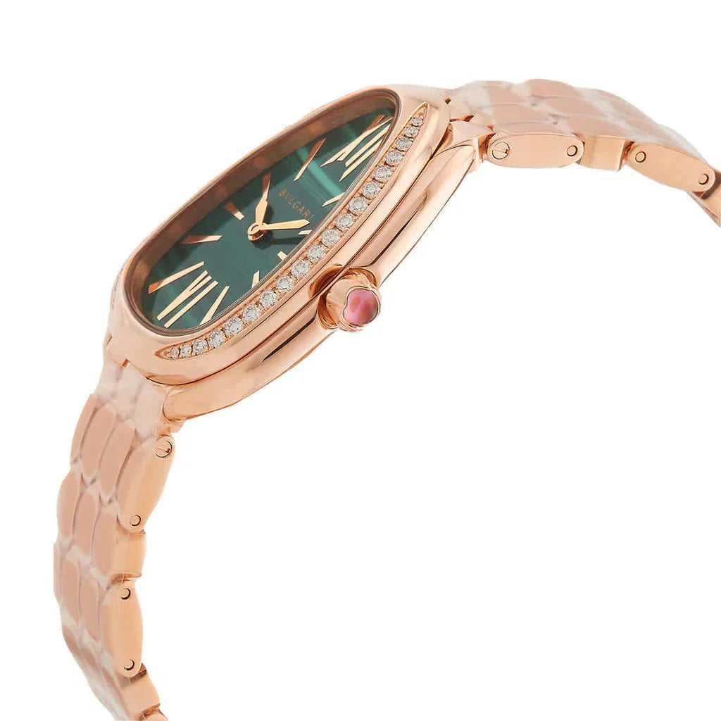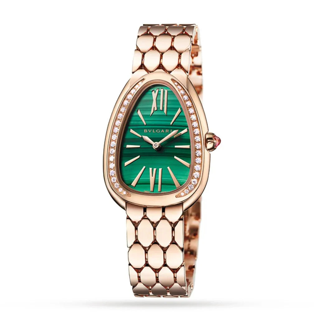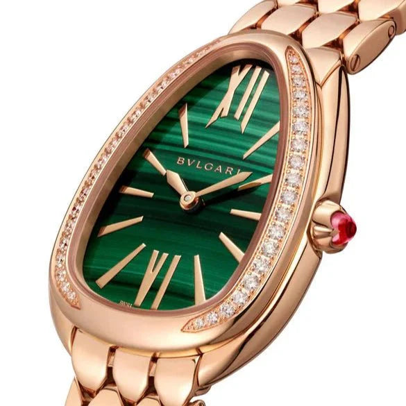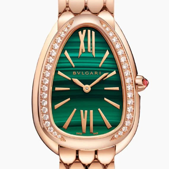 Expertly crafted by Bvlgari, the Serpenti Seduttori Diamonds watch for women boasts a stunning green dial and a luxurious rose gold steel strap. With its timeless design and sparkling diamonds, this watch exudes elegance and sophistication. Elevate your look with this exquisite timepiece.