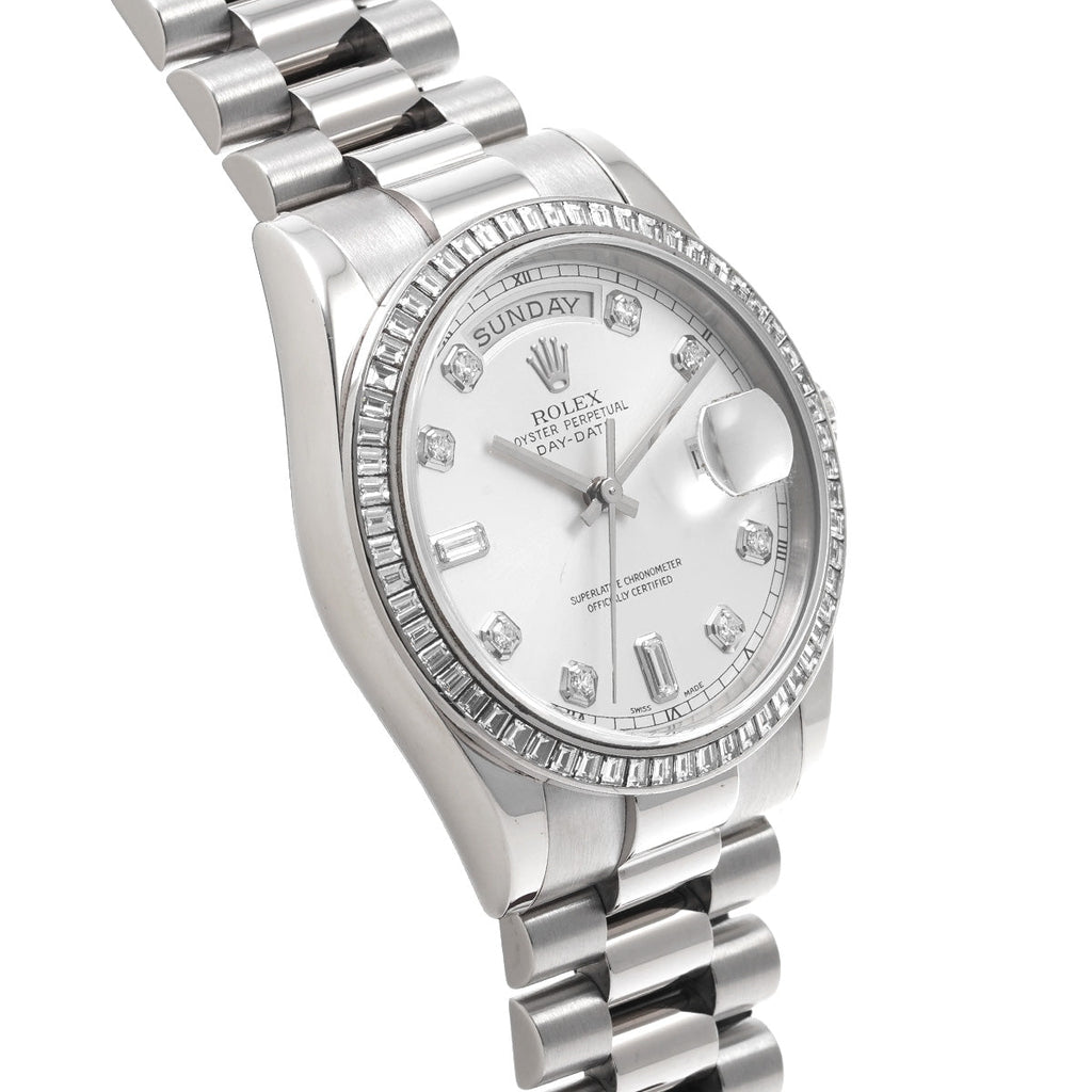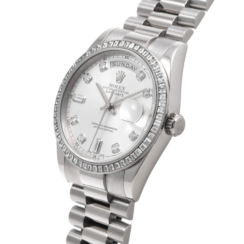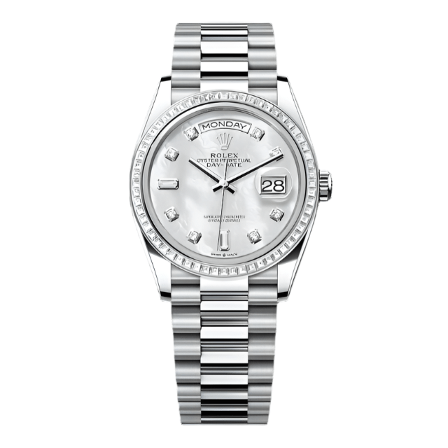 The Rolex Lady Day-Date 36 128349RBR is a top-of-the-line luxury watch designed with precision and sophistication. With its stunning diamond-set bezel and radiant mother-of-pearl dial, this watch makes a bold statement. Its water-resistant and automatic movement features ensure durability and accuracy, making it a reliable and stylish choice for any occasion.