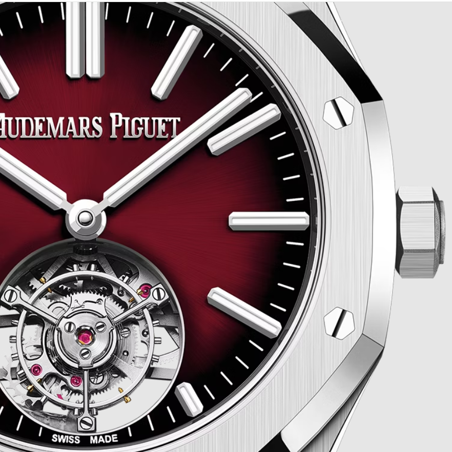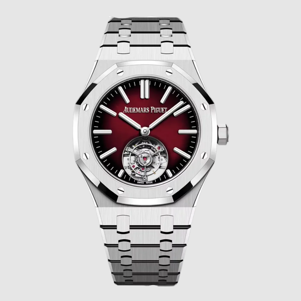 The Royal Oak Selfwinding Flying Tourbillon 41 mm represents the pinnacle of haute horlogerie craftsmanship. This timepiece combines Audemars Piguet's iconic octagonal case design with a sophisticated flying tourbillon mechanism, visible through the exhibition caseback. The 41 mm case strikes an ideal balance between presence and wearability, while the self-winding movement ensures reliable timekeeping through daily wear. Finished with meticulous attention to detail, this watch exemplifies technical mastery and refined aesthetics for the discerning collector.